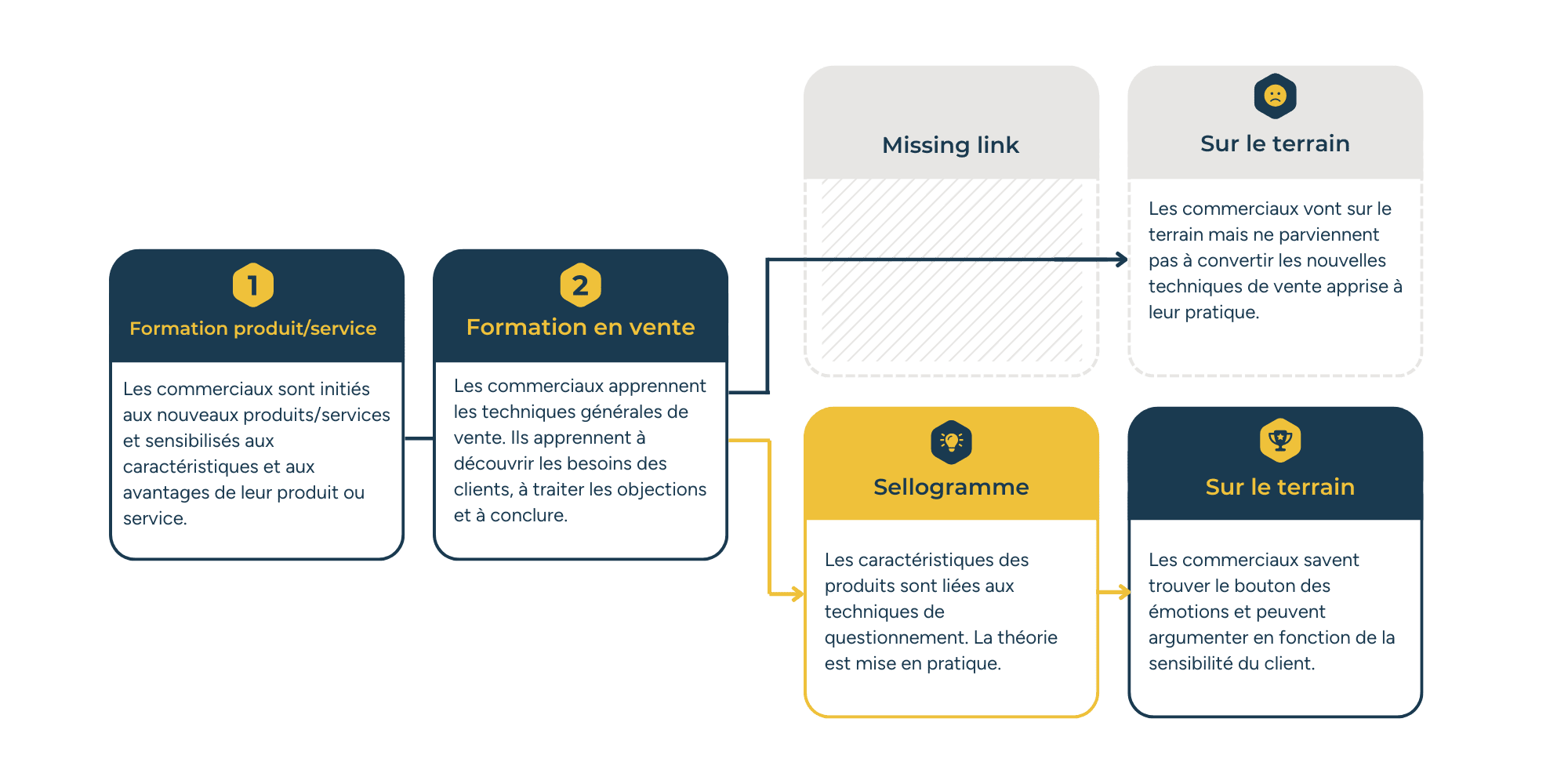 Votre équipe apprend à utiliser le Sellogramme dans ses entretiens, à surmonter les objections et à conclure de manière plus intelligente.